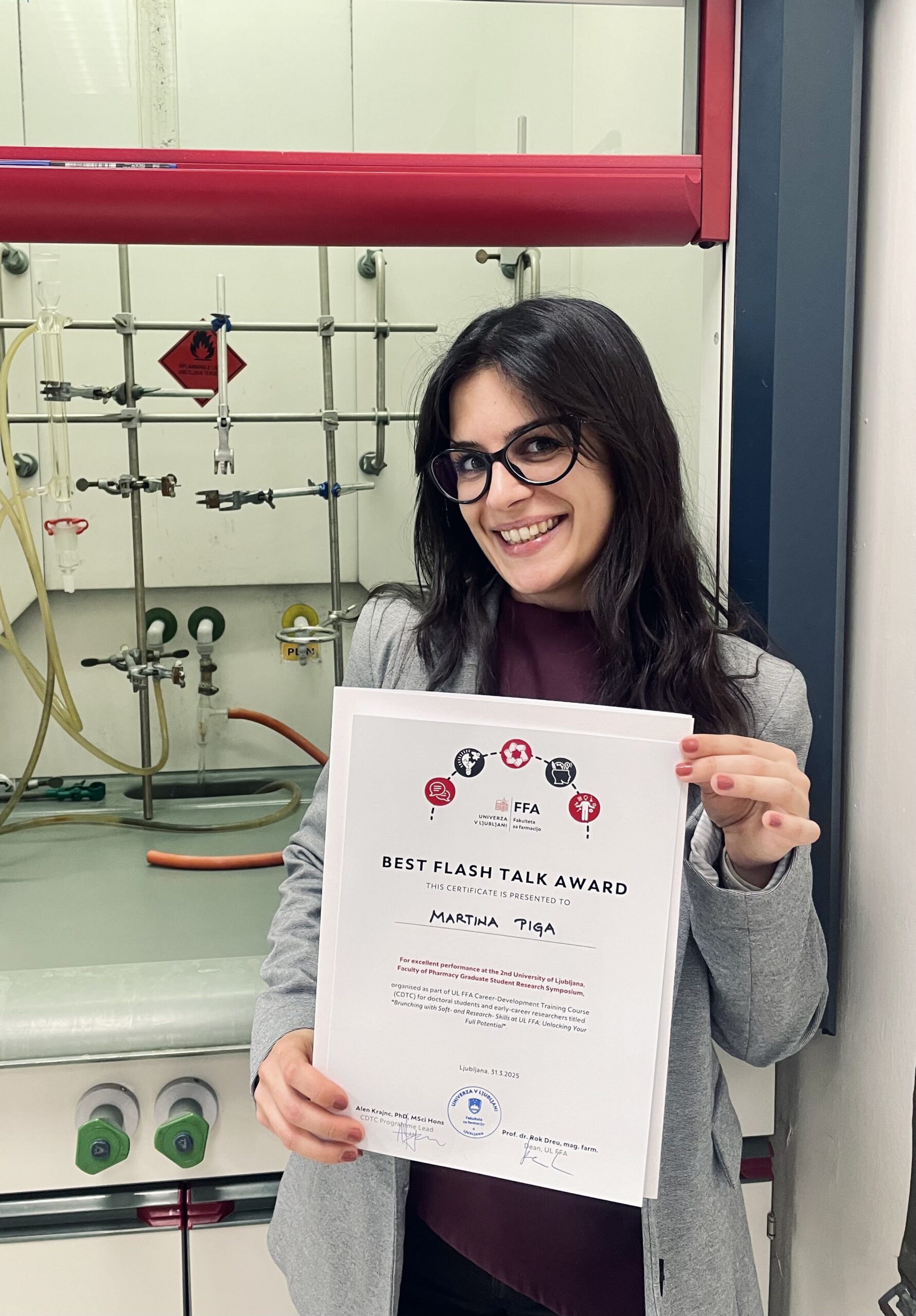 On Monday, March 31st, 2025, during the 2nd UL FFA Graduate Student Research Symposium held at the Faculty of Pharmacy, University of Ljubljana, Asist. Martina Piga and Ivan Džajić received the Best Flash Talk Awards for their excellent performance.